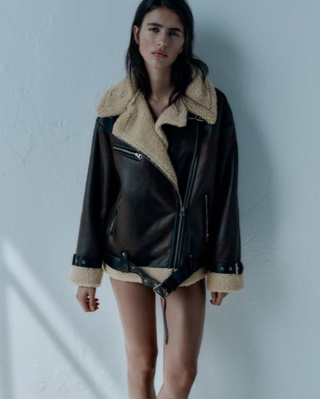 Zara tiene en su catálogo esta exclusiva pieza atrevida y original. Propone un corte tipo biker con solapa, cremalleras y cinturón. El contraste entre el tejido exterior liso y el interior de borreguillo generan algo distinto que hace que todas las que la descubren la aman. Una prenda híper abrigada y cómoda, que brinda un toque rockero. Es posible encontrarla en color negro y marrón oscuro. Algunas deciden combinar este asombroso diseño con unos pantalones de cuero y otras se decantan por una minifalda de cuero. La cuestión es que, de cualquiera de las maneras, ¡logran causar sensación! Su precio es 69,95 euros.