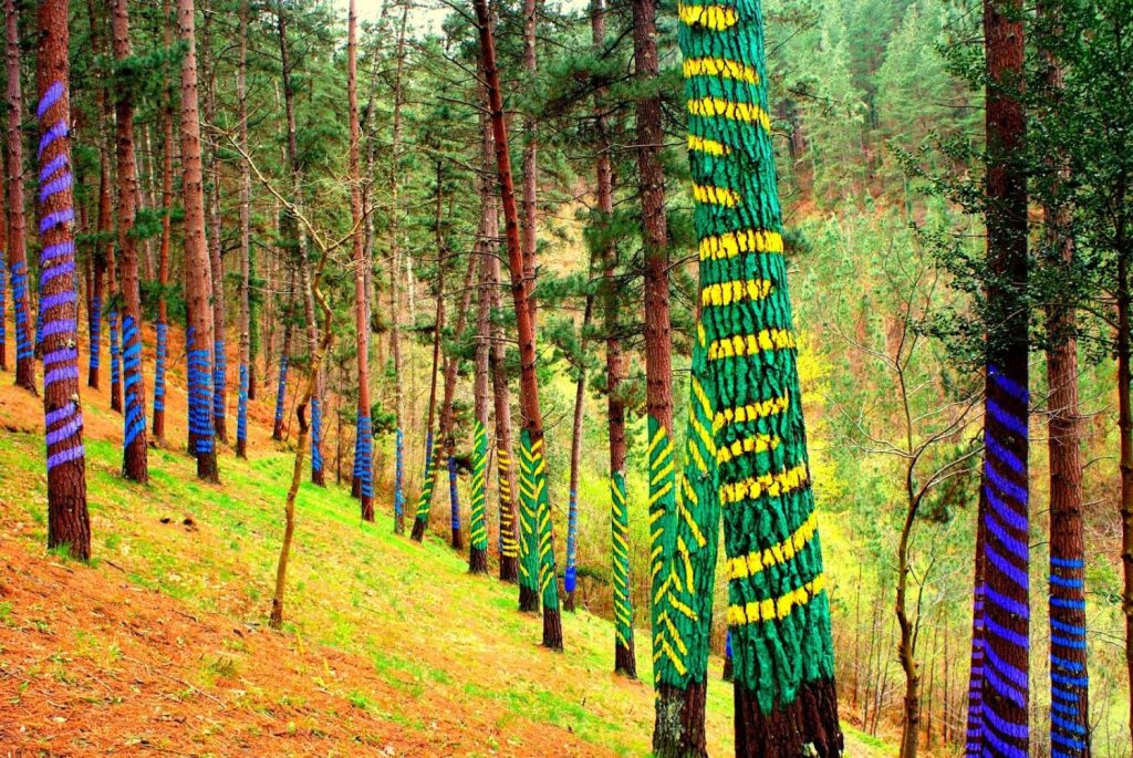 El Bosque de Oma: Uno de los proyectos más emblemáticos de Ibarrola es el Bosque de Oma, una intervención artística en plena naturaleza. En la ladera de una colina en la Reserva Natural de Urdaibai, Ibarrola pintó figuras geométricas y humanas en los troncos de los árboles, creando una experiencia visual en constante cambio a medida que los visitantes se desplazan por el paisaje.