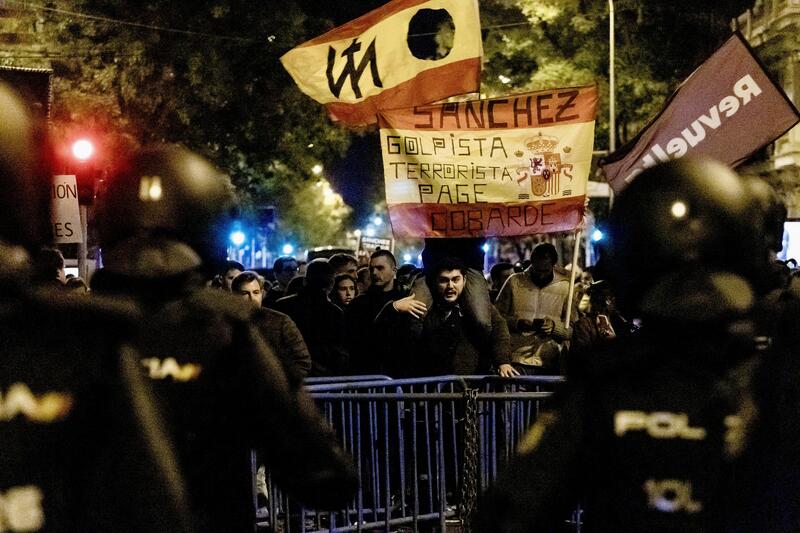Los concentrados en Ferraz portaban banderas de España, banderas carlistas y algunas franquistas y han cantado en reiteradas ocasiones el ‘Cara al Sol’, además de reivindicar la figura de José Antonio Primo de Rivera. También se han escuchado cánticos en contra de Sánchez y del Gobierno, al que han calificado de «gobierno golpista» y «España no se vende, España se defiende», y en contra de Puigdemont.
