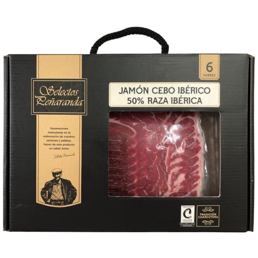 5Alcampo: SELECTOS PEÑARANDA Maletín con 6 sobres de 150 g. de jamón de cebo ibérico (50% raza ibérica), cortado en lonchas con separador SELECTOS PEÑARANDA 900 G