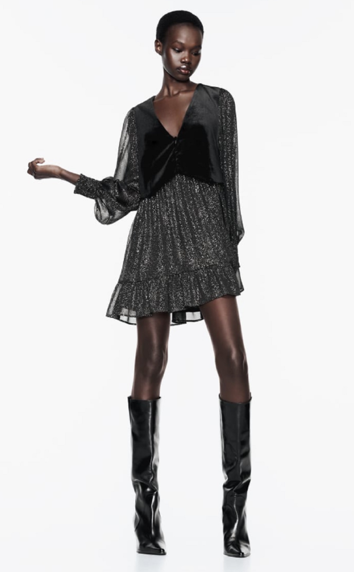 Está claro que este vestido de Zara está hecho para brillar. Una pieza de escote pico y manga larga acabado en puño elástico, detalle de hilo metalizado y chaleco con tejido combinado con terciopelo. Además, lleva un forro interior, bajo con volante y botones delanteros. Vale 35,95 euros. Aquellas que buscan acaparar todas las miradas pueden coronar este espectacular modelo con unas buenas botas altas, que imprimen al look un aire de elegancia y sofisticación ideal. En cuestiones de estilo no hay nada escrito, simplemente debes buscar lo que te haga sentir cómoda y refleje lo estupenda que te sientes por dentro.