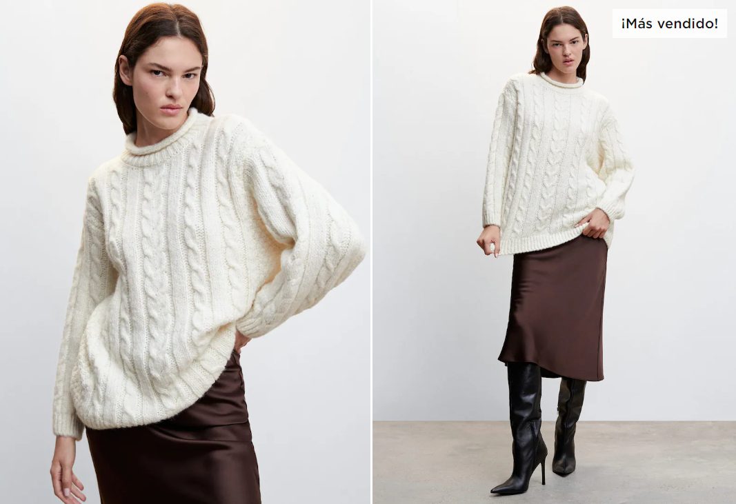 Otro de los básicos que no querrás que falten en tu armario es este jersey. Llama la atención, en primer lugar, gracias a su bonito y fácil de combinar color blanco, uno de esos neutros que nunca fallan. Asimismo, también destaca por estar elaborado en lana y por su acabado trenzado, muy sencillo y elegante al mismo tiempo. Por supuesto, ahora en Mango Outlet lo puedes conseguir, por su parte, a un precio de lo más especial. En la actualidad, te puedes hacer con él por tan solo 27,99 euros cuando antes costaba 45,99. No te querrás quedar sin probarlo.