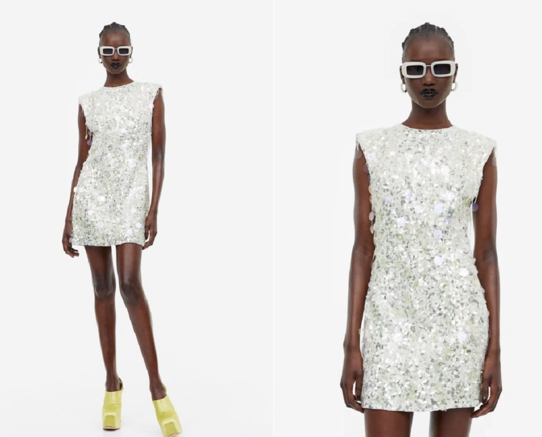 Por aquí te dejamos la versión corta del vestidazo que llevó Victoria de Suecia. No tiene mangas y en su composición predominan el lino y la viscosa. Para que se vea todavía más bonito le han añadido unas lentejuelas, que le aportan un toque de brillo y textura. Dispone de un cuello redondo, hombreras para estilizar la silueta y cremallera oculta detrás del tirador de plástico en forma de labios. Además, lleva un forro de satén. Este es uno de los modelos de H&M que tiene todas las papeletas para ser tu próximo look de Nochevieja.