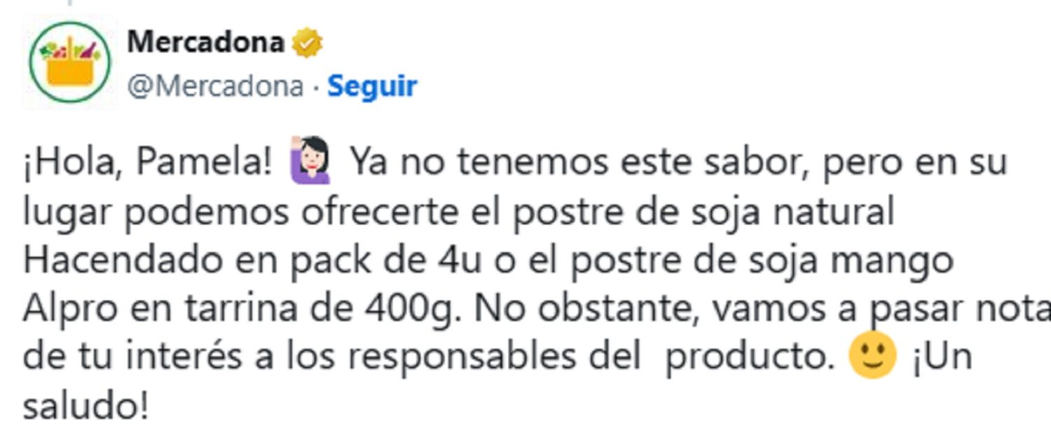 En los últimos días, varios consumidores de Mercadona han alzado la voz y se han quejado porque no podía encontrar este producto en sus locales. La entidad valenciana ha decidido contar lo que ha pasado. “Mercadona por favor, ¿pueden volver a poner a la venta el yogur de soja sabor mango?, al menos en Barcelona ya no está. Me gustaría que tuvieran también otros sabores de yogur sin lactosa aparte del de fresa y natural”, expuso una cliente por X (Twitter).