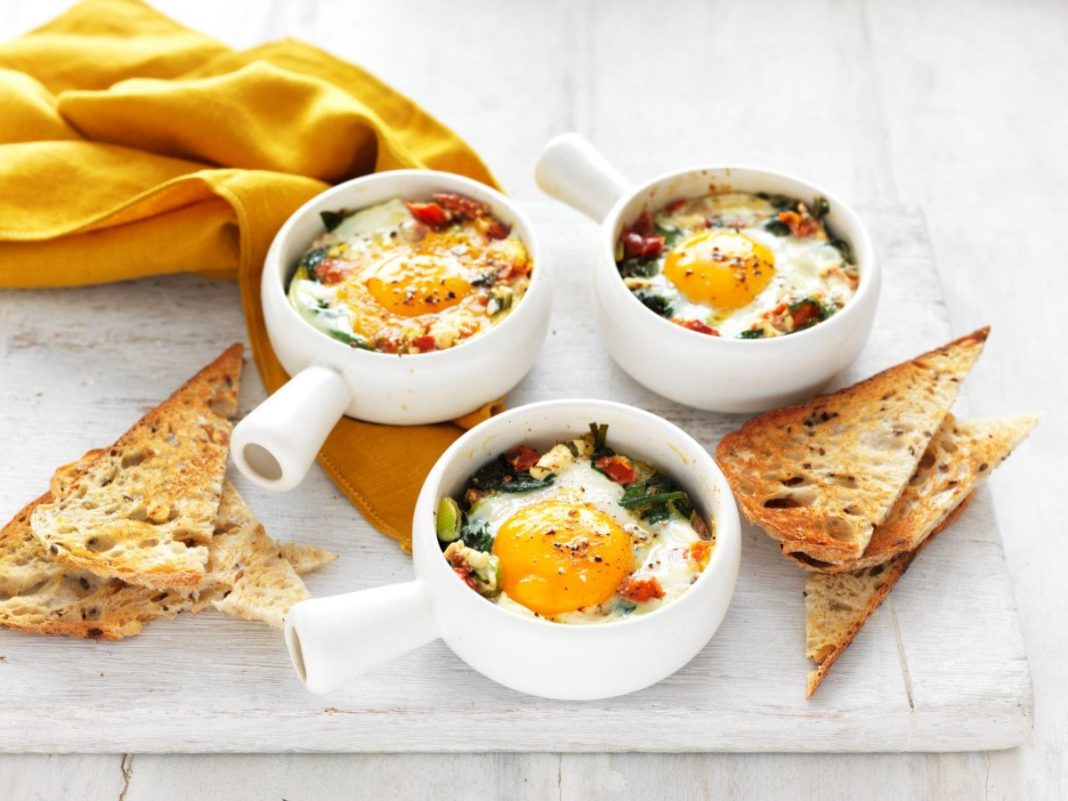 Engrasa fuentes, cazuelas o sartenes refractarias y coloca un par de huevos por persona, ajustando según las necesidades o el momento del día. Agrega nata líquida, bechamel o leche, y dispón ingredientes preparados o de cocción rápida (queso, verduras salteadas, pisto, salsa de tomate, beicon, jamón, chorizo, legumbres, etc.). Salpimenta y hornea de 8 a 12 minutos hasta que los huevos alcancen el punto deseado.