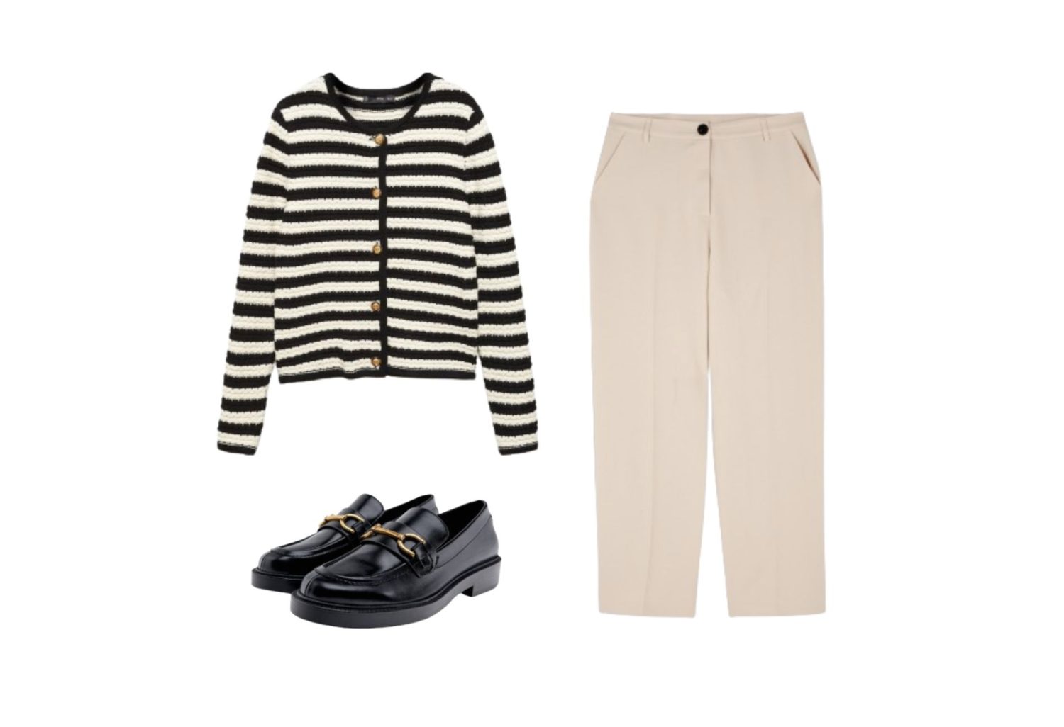 Inspiradas por el inconfundible estilo de las mujeres francesas, descubrimos el arte de la elegancia discreta al combinar los pantalones blancos de Primark. Optamos por un cárdigan a rayas de Mango, con cuello redondo y botones joya, que añade un toque femenino y sofisticado al conjunto. Este cárdigan no solo refleja el lujo silencioso, sino que también se convierte en la pieza central para lograr un look impecable.