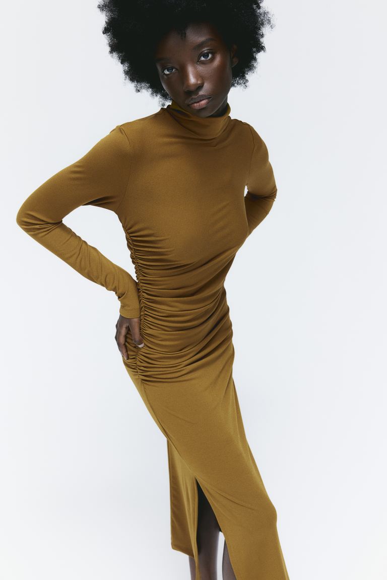 Sin duda, dentro de la web de H&M tienes la oportunidad de hacerte con una gran cantidad de vestidos que te servirán tanto para lucir elegante en estos días festivos como para tus looks del día a día, según cómo los combines. Uno de los que más llaman la atención es este vestido con detalles fruncidos que destaca gracias a su cuello perkins, uno de los más favorecedores, así como por su tono mostaza oscuro. También disponible en colores como gris y el negro, lo puedes conseguir en la tienda por tan solo 25,99 euros.