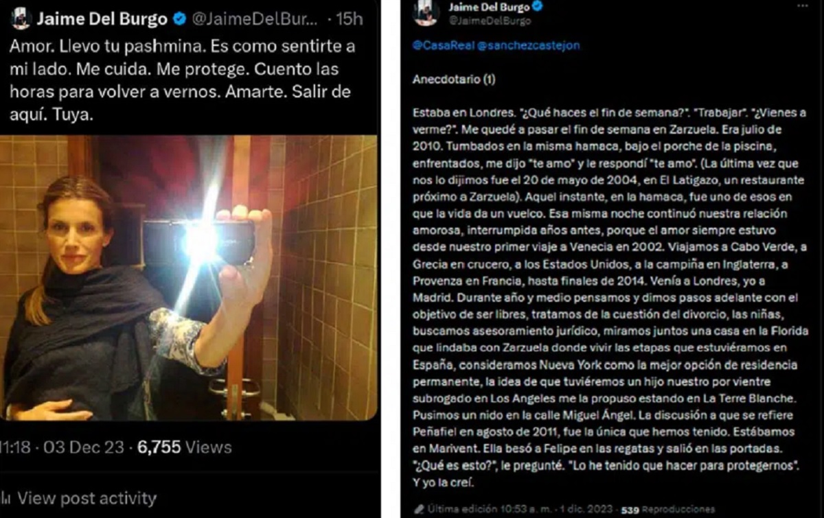 Del Burgo dio detalles sobre ese romance con la reina Letizia y expuso que retomaron su vínculo después de la boda de la experiodista con Felipe y que ese romance siguió por años. Concretamente habló sobre un episodio que sucedió en 2010 en la Zarzuela: “Tumbados en la misma hamaca, bajo el porche de la piscina, enfrentados, me dijo ‘te amo’, y le respondí, ‘te amo’. Esa misma noche continuó nuestra relación amorosa”. Aseguró además que la comunicadora estaba dispuesta a divorciarse de Felipe VI. Estableció en X una línea temporal de cómo sucedieron las cosas.