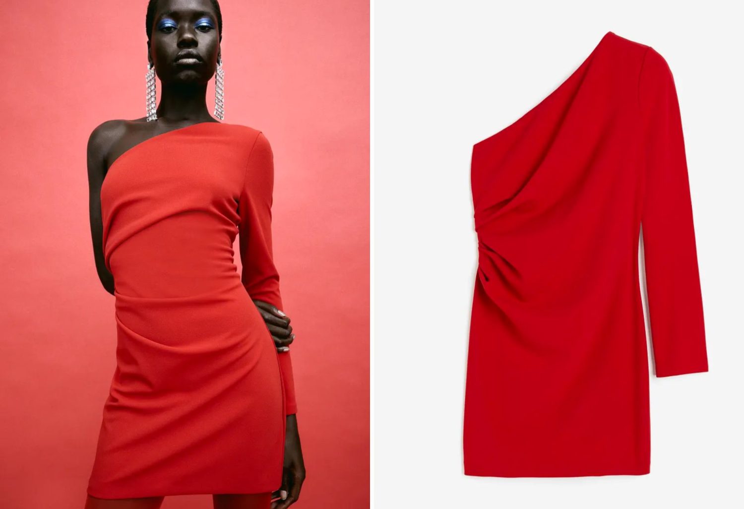 Conquista las miradas en los días festivos con el vestido rojo de H&M, una joya asequible a solo 25,99 euros. Este encantador diseño asimétrico te ofrece un estilo distintivo que no pasará desapercibido. El vestido corto, confeccionado en tejido elástico, presenta un hombro al descubierto y una manga larga, añadiendo un toque de sensualidad y elegancia.