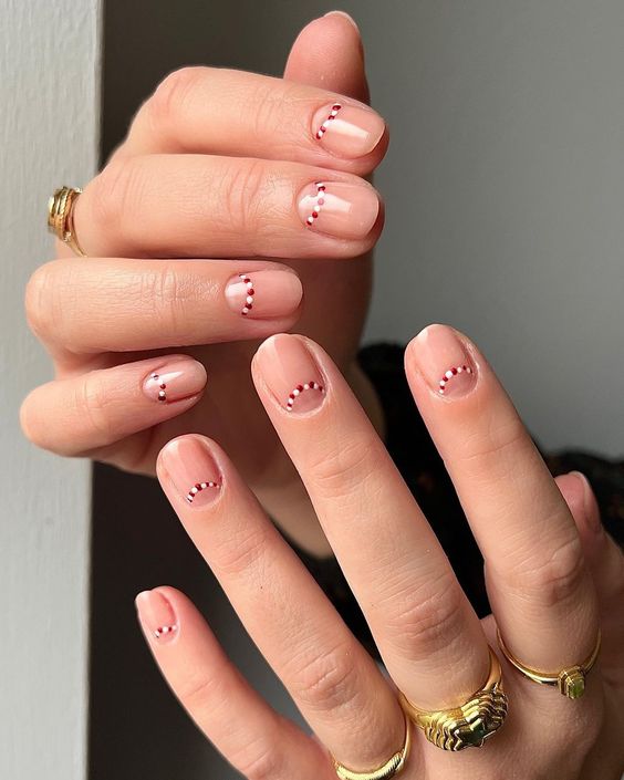 Un motivo muy navideño es el bastón de caramelo. Dibuja pequeños toques de rojo y blanco sobre tus uñas transparentes para crear una manicura de inspiración navideña manteniendo el minimalismo. El resultado será muy elegante.