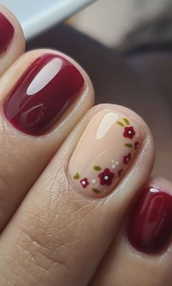 Los diseños florales siempre consiguen captar todas las miradas. En este caso, puedes pintar tus uñas de un tono granate o color vino y dejar la del dedo anular en tono nude o transparente para dibujar por encima flores al tono con un toque verde. Conseguirás un resultado muy llamativo y sencillo.