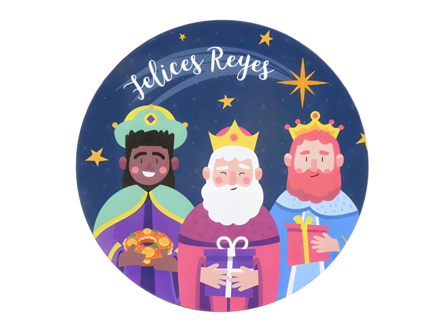 Para las ocasiones más informales o para deleitar a los más pequeños de la casa, Alcampo ofrece el bajoplato TABERSEO, una opción llena de color y alegría. Este bajoplato de plástico redondo se destaca por su estampado colorido que representa a los Tres Reyes Magos, dibujados en un estilo caricaturesco y con expresiones alegres y sonrientes.