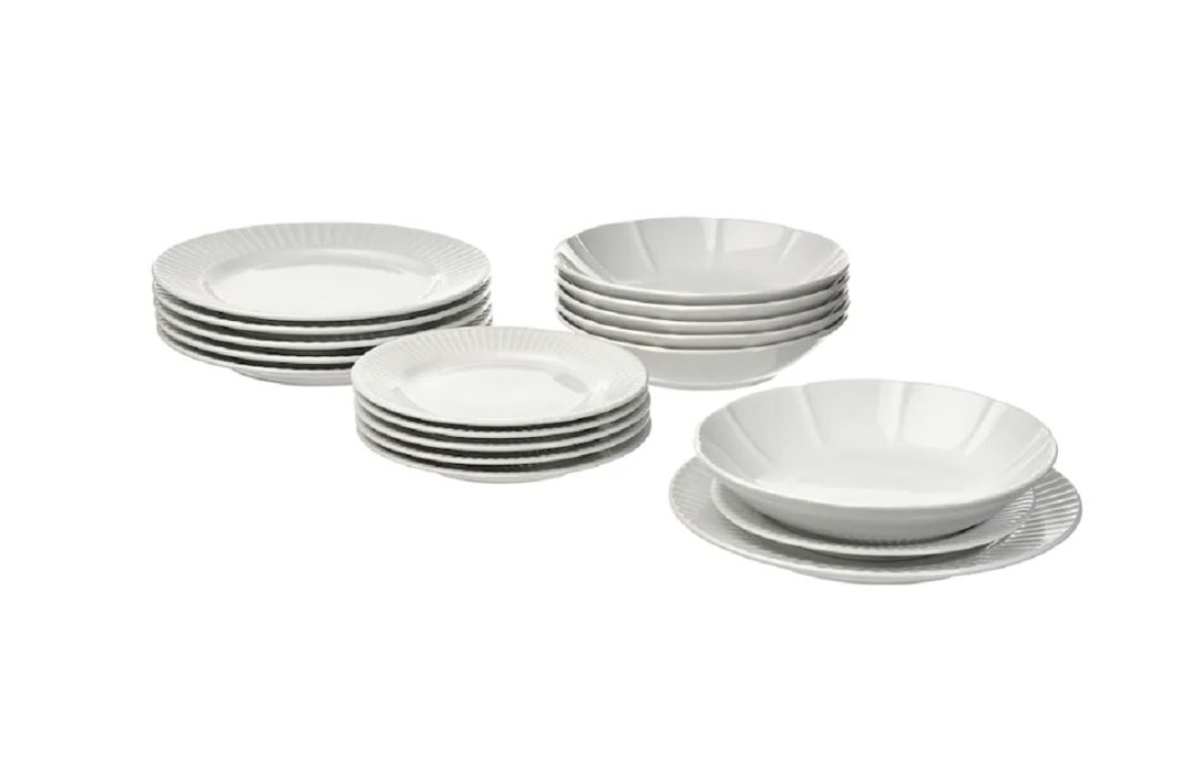 Iniciamos con las estupendas vajillas que podemos encontrar en Ikea. No solo encontramos diseños o estampados navideños, sino que también podemos elegir entre dos modelos súper elegantes, perfectos para decorar la mesa en Nochebuena o en cualquier otra fecha señalada. Hablamos de la vajilla Strimming, que es una de las novedades de Ikea. Es de color blanco y trae 18 piezas por 49,99 euros. Tiene 5 platos hondos, 5 grandes, 5 pequeños, dos platos para servir y una ensaladera o bol. Está hecha de gres, por lo que es apta para utilizar en el microondas y lavavajillas. Además, su diseño está inspirado en la naturaleza escandinava y sencillez japonesa.