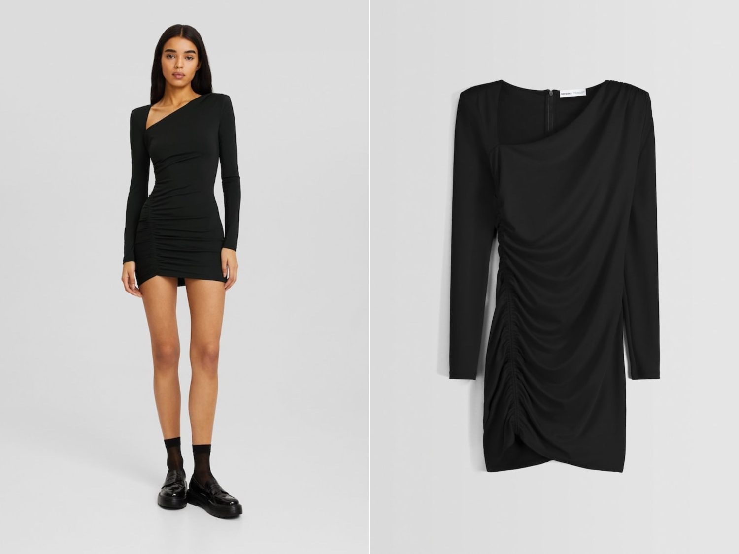 5Vestido mini manga larga con hombreras y frunce lateral: asimetría en el escote
