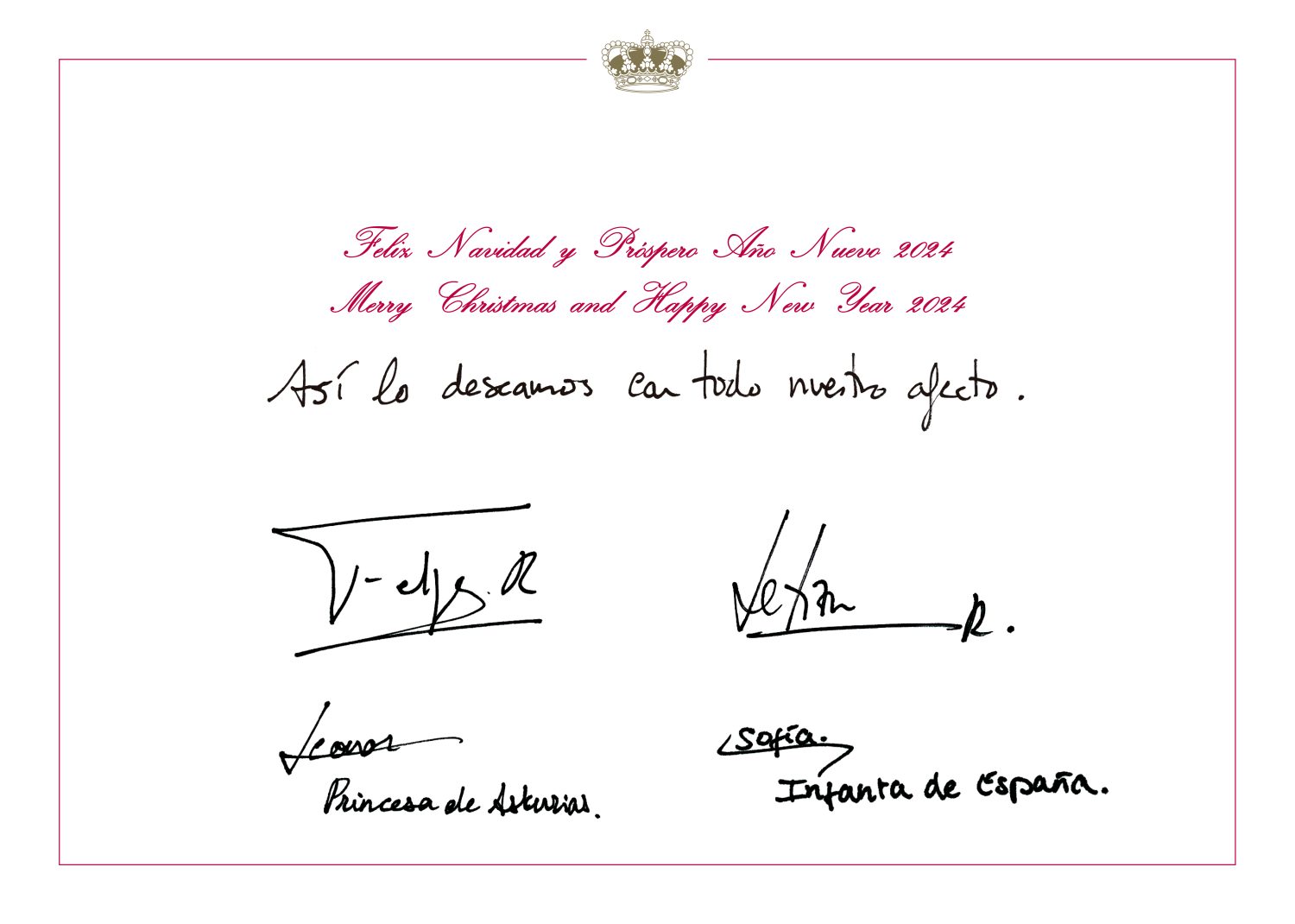 Son muchos los detalles que se pueden observar en esta imagen elegida por la Familia Real para despedir el 2023 y dar la bienvenida a 2024. La felicitación tiene, además, un doble sentido. Además del día de la jura de la Constitución, el 31 de octubre también fue cuando la Princesa Leonor alcanzó su mayoría de edad. En el texto que acompaña a la fotografía, se puede leer lo siguiente: «Feliz Navidad y Próspero Año Nuevo 2024. Así lo deseamos con todo nuestro afecto». Como ya es costumbre, el texto está acompañado por las firmas de los cuatro miembros, un gesto que vuelve a demostrar su unión sin importar lo que suceda.