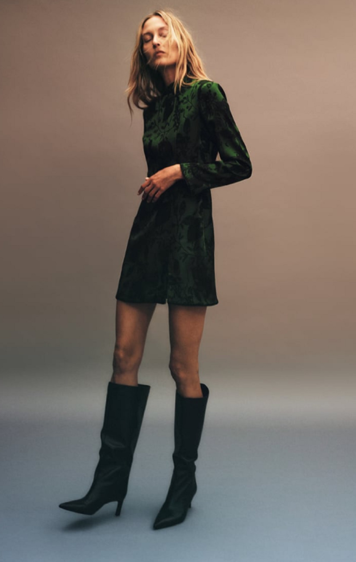 Zara nos deleita con esta otra preciosidad, disponible por 35,95 euros. Un vestido verde jacquard con cuello subido y manga larga, bajo con abertura frontal y espalda abierta. Es uno de los diseños más preciosos de Zara de este año y aparecer con él en cualquier reunión de categoría o incluso en la ofi es una apuesta segura. Si quieres triunfar, ser la reina de la fiesta y que todos pregunten por ti, solo tienes que hacerte con el tuyo. Es un excelente regalo también de cara a la Navidad.