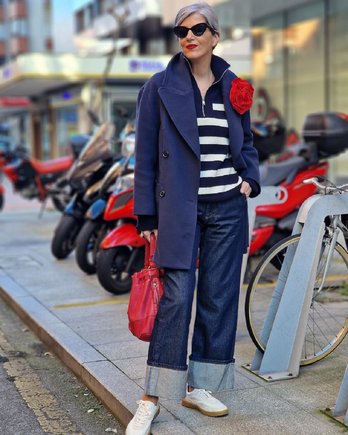Carmen Gimeno ha arrasado en su perfil de Instagram con este chulísimo jersey de punto y tayas. La mayoría de los que hemos visto el posteo de la creadora de contenido hemos pensado en París, debido al aire chic y distendido con el que llevó las prendas. Remató su look de manera magistral con un vistoso broche floral tamaño XXL en rojo, a juego con su bolso. También son de Zara, aunque de temporadas pasadas. El jersey de punto y rayas presenta un cuello alto, manga larga y una cremallera en la parte frontal que llega aproximadamente hasta la altura del pecho. La marca advierte en su web que la talla que viene suele ser más grande de lo habitual, un dato no menor si vas a pedir el jersey por internet. Su precio es 29,95 euros.