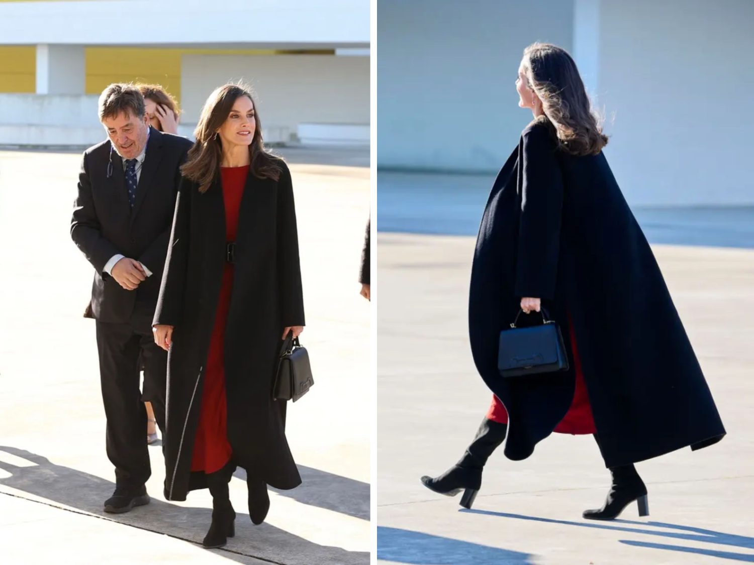 Para afrontar las bajas temperaturas, Doña Letizia se resguardó con un abrigo largo negro de Carolina Herrera, aportando una dosis de elegancia y sofisticación a su conjunto. Complementó su atuendo con unas botas de ante con tacón, ideales para el clima frío, manteniendo un estilo refinado y coherente. Además, llevó un bolso de la misma firma que el abrigo, añadiendo un toque de clase a su presencia.