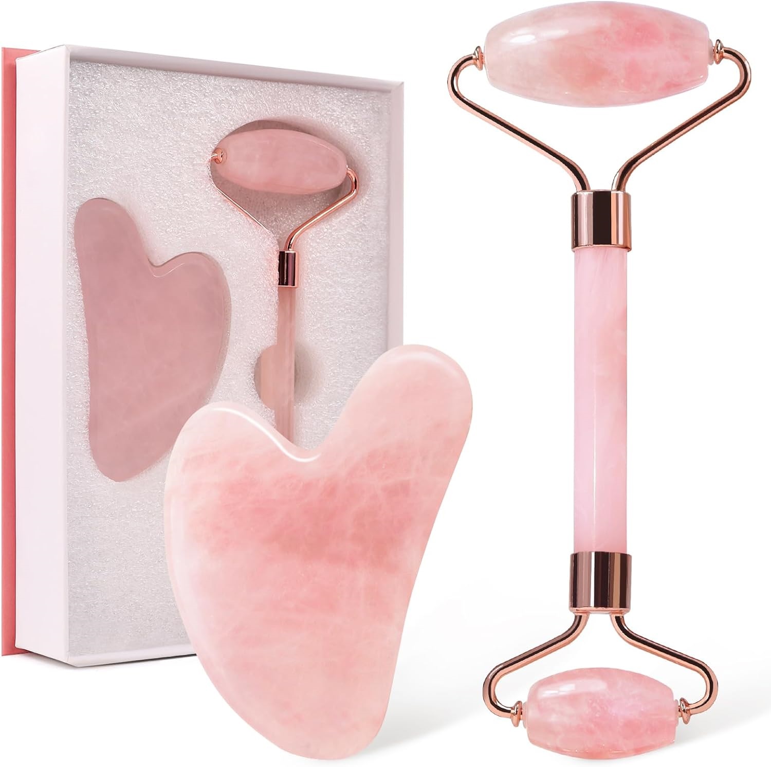 1Regalos que enamoran: Gua Sha y Rodillo de Jade de Cuarzo Rosa