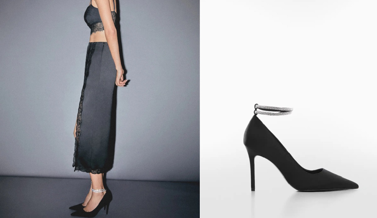 No podíamos terminar esta exquisita selección de calzados sin nombrar a los modelos básicos con pulsera en el tobillo. Cada vez se ven más en las tiendas, quedan súper top y, si no los tienes, deberías ir corriendo a por uno de ellos. De hecho, se tornan como el regalo perfecto para el día de Reyes y el elemento infaltable de cara a la cena de Fin de Año. Las francesas quedan estupefactas al ver esta maravilla. Es más, en el desfile de la casa de alta costura francesa Givenchy se utilizaron este tipo de calzados (aunque los suyos eran más tipo stiletto) con faldas midi. Hemos encontrado este diseño tentador en Mango a 39,99 euros.