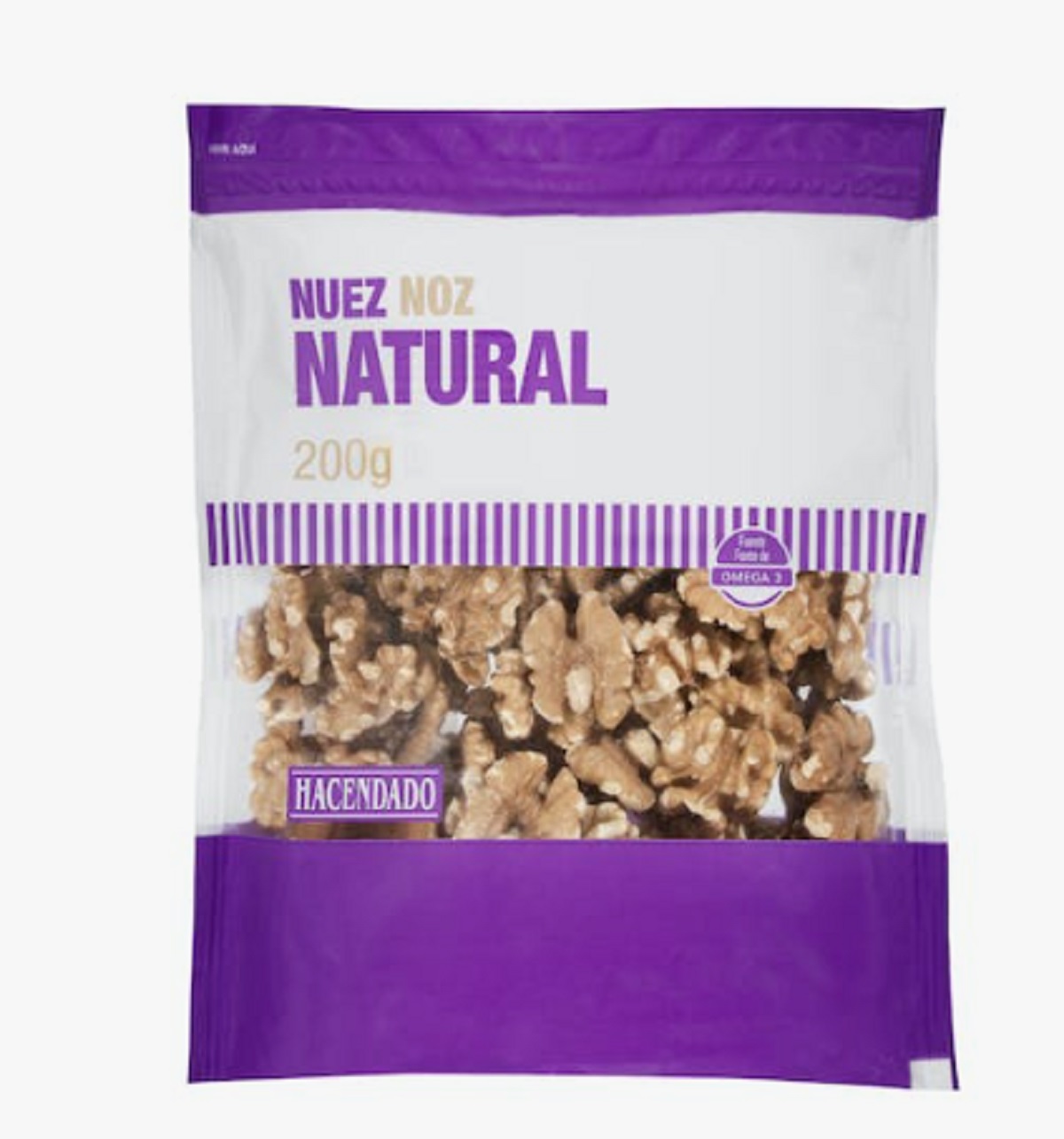 Las nueces también son un producto al que recurrir cuando hablamos de frutos secos. Entre sus virtudes es de destacar su aporte en Omega 3. En su valor nutricional se destaca que, por cada 100 gramos de producto, hay 716 calorías, 69,6 gramos de lípidos (6 gramos de grasas saturadas, 9,6 gramos de monoinsaturadas y 53,7 gramos de poliinsaturadas), 2,2 gramos de carbohidratos (de los 1,7 gramos son azúcares), 6,2 gramos de fibra alimentaria, 17 gramos de proteína y 0 gramos de sal. La bolsa de 200 gramos se vende a 2,15 euros.