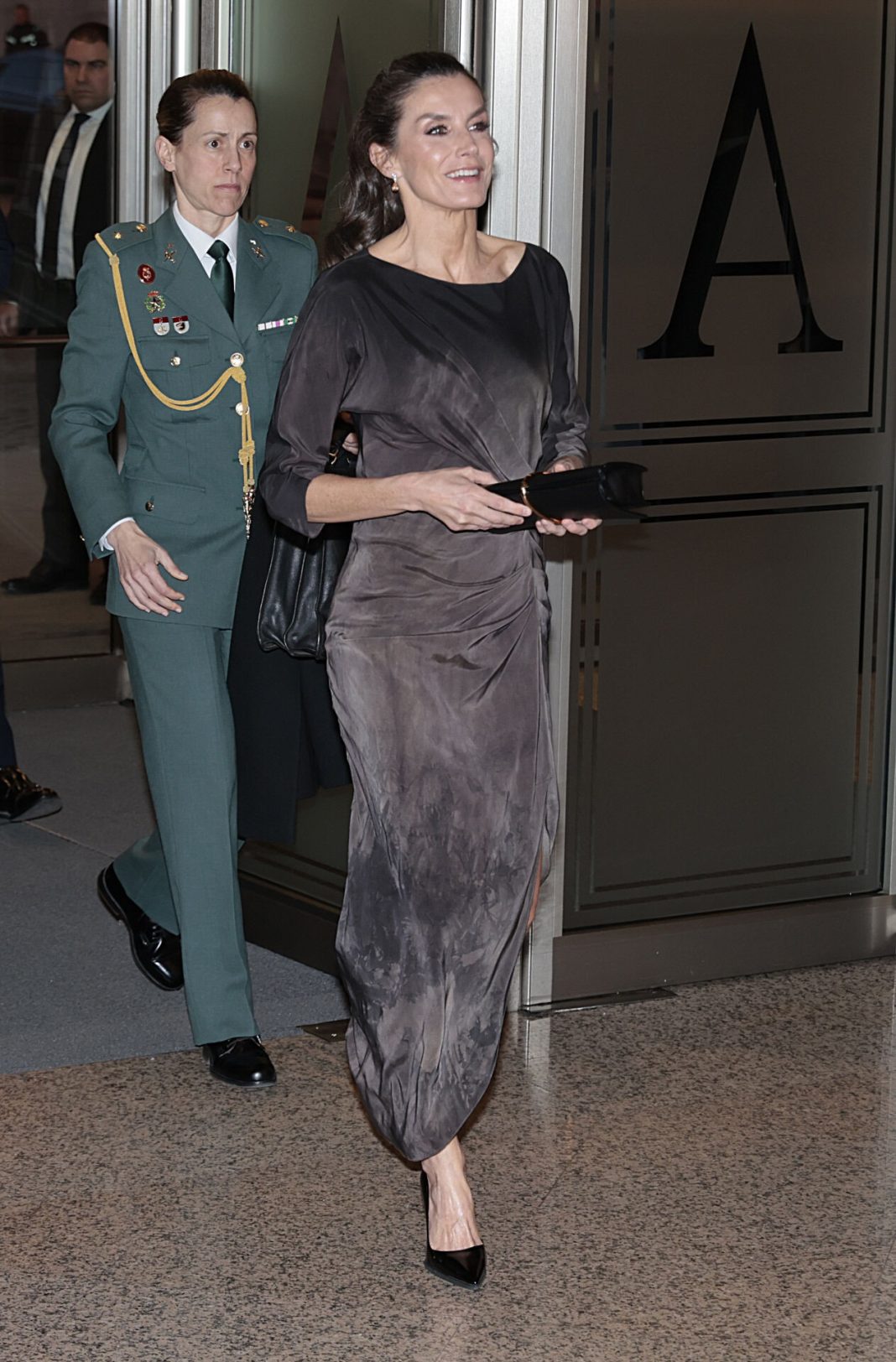 En el concierto homenaje a las víctimas del terrorismo, la madre de la infanta Sofía apareció con un vestido de la firma española Cortana, un diseño especial por el tejido que se utilizó, de seda strech con efecto maltinto. Lleva sobre la prenda ligeras variaciones de color, haciendo que cada modelo sea único. Con una pieza diferente a la que podría llevar cualquier otra persona, la experiodista acudió dichosa y orgullosa de lo que llevaba puesto. Asimismo, haber escogido un color oscuro fue un acierto debido al contexto en el que se desenvolvió la royal.