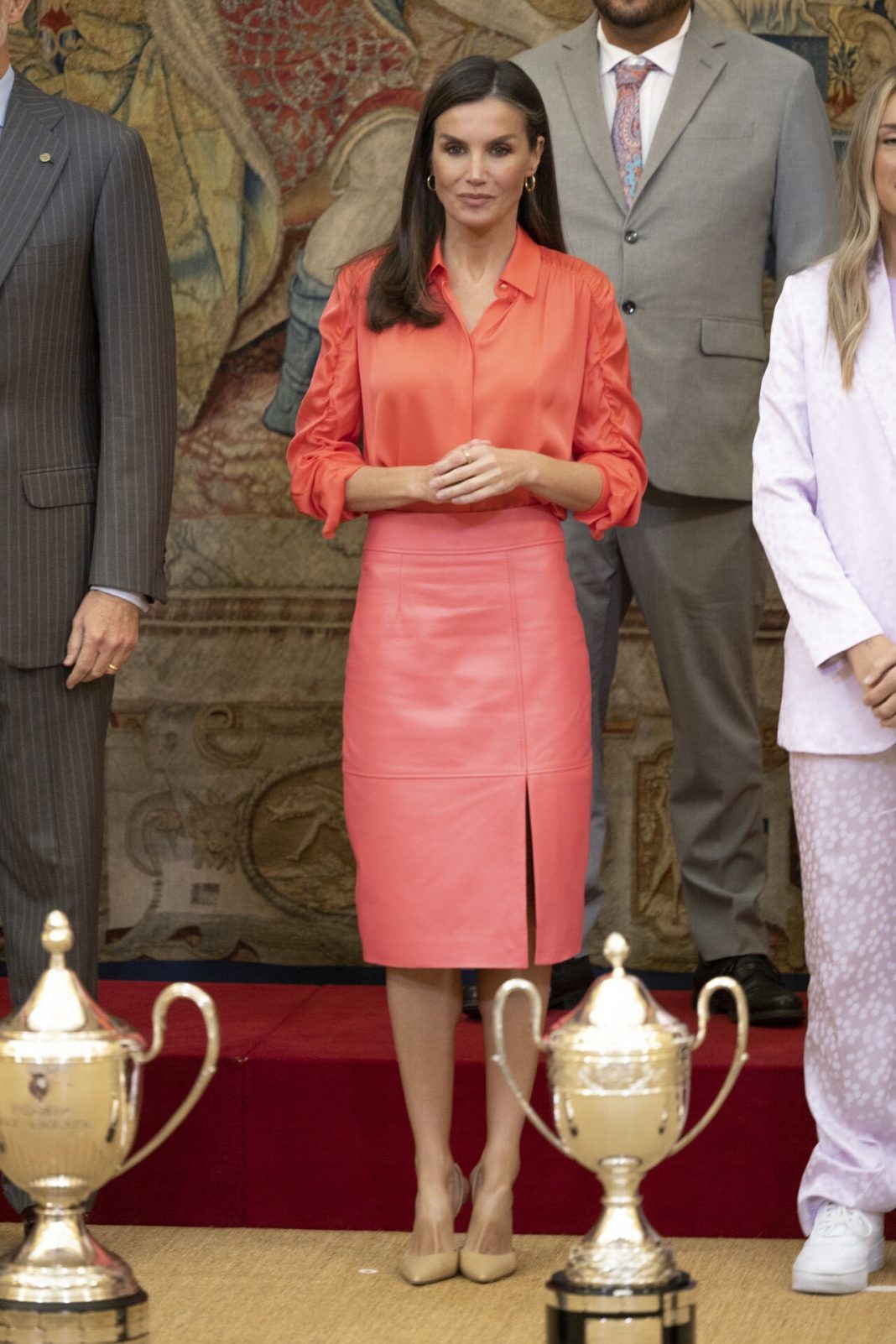 La Reina Letizia se mimetizó con la llegada de la primavera este 2023 y se dejó ver con un llamativo conjunto de Hugo Boss en color coral, con una falda de cuero y camisa a juego. Una vez más, la nuera de Juan Carlos I demostró que tiene una gran versatilidad a la hora de vestir, logrando culminar cada estilismo de una manera extraordinaria. La royal logra entender cuál es el punto de equilibrio entre un look distendido y uno formal.