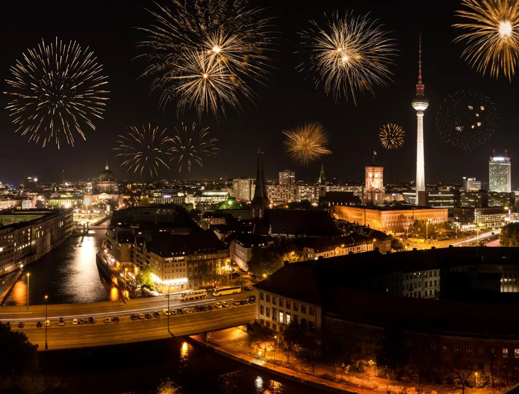 La celebración de fin de año en la Puerta de Brandeburgo es una de las más impresionantes del mundo. La icónica puerta se convierte en el epicentro de la fiesta, con actuaciones en vivo, proyecciones de luz y un espectáculo de fuegos artificiales que ilumina el cielo nocturno. La vibrante vida nocturna de la ciudad y sus clubes famosos complementan esta celebración festiva.