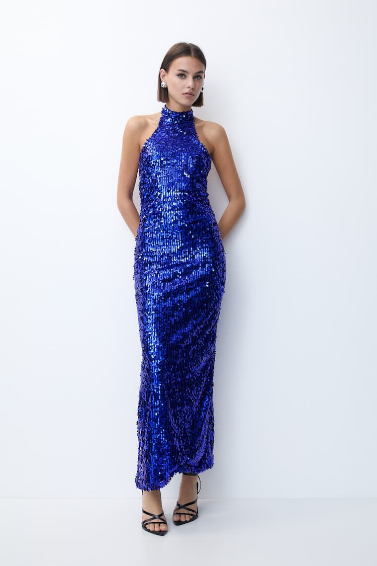 ¡Otro imprescindible en la colección de fiesta es el deslumbrante vestido largo halter con lentejuelas! En un llamativo tono azul, presenta un cuello halter con cierre de botón, espalda descubierta y mangas sisa. Este vestido, más largo de lo habitual, es increíblemente favorecedor y elegante, ajustándose a la figura con una atractiva abertura en el lateral de la falda para un movimiento fluido. Sumérgete en la intensidad del azul con este destacado vestido, disponible en Pull & Bear por solo 35,99 euros. ¡Añade un toque de glamour a tu estilo!