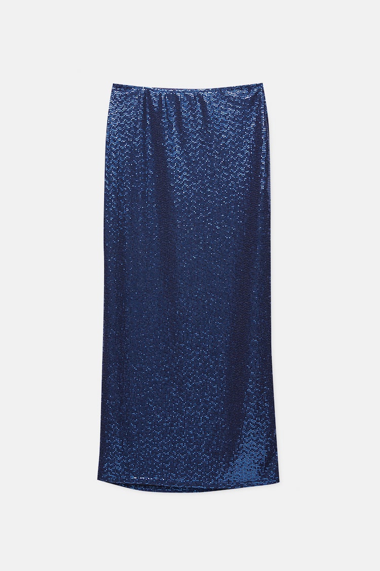 Celebra estas fiestas con estilo luciendo nuestra Falda Larga de Brillo! Elaborada en un tejido ligeramente elástico con encantadores detalles brillantes, esta falda, compuesta por un 93% de poliamida, 4% elastano y 3% de fibra metalizada, se ajusta perfectamente al cuerpo. Disponible en un vibrante azul eléctrico y en gris. Para un look completo, combínala con un top a juego de la misma colección de la blazer. ¡Consíguela en Pull & Bear por solo 22,99 euros y brilla con elegancia en tus celebraciones!