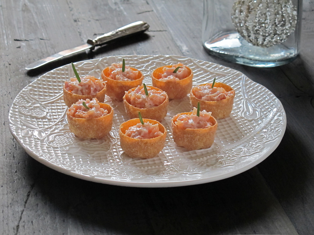 En la batidora, coloca el salmón troceado y añade queso, nata, zumo de limón, pimienta y sal al gusto. Tritura hasta obtener una mezcla suave y homogénea. Rellena las cestitas con la crema, agregando cucharadas generosas. Coloca sobre ellas las tiras de salmón cortadas por la mitad y enrolladas. Decora con germinados lavados y secos. Sirve de inmediato.