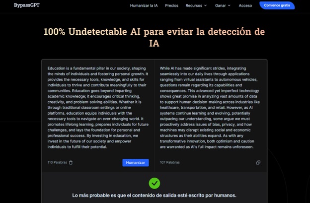 BypassGPT también es un bypasser de detección de IA y un humanizador de IA de última generación. Si has tenido que revisar tu texto manualmente debido a un detector de IA, esta herramienta de omisión de contenido de IA es la opción ideal ya que puede personalizar fácilmente el texto de IA.