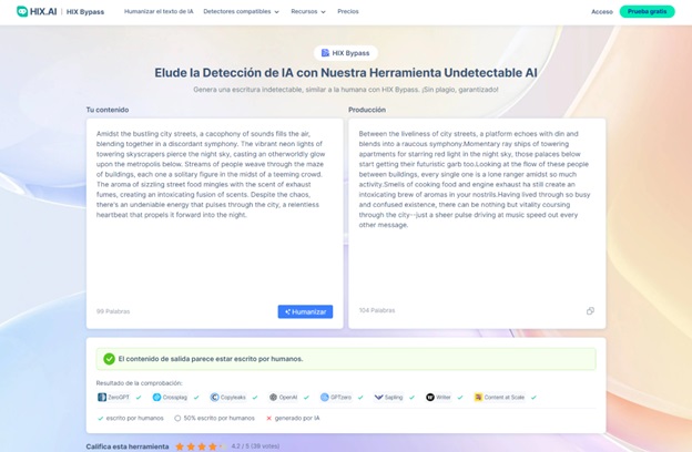 Otra gran ventaja de este perfeccionador de texto con IA es que puedes usarlo de forma gratuita con un límite de 125 palabras para probar la capacidad de HIX Bypass. Esta prueba te permite ver de primera mano la eficacia con la que funciona para evitar una variedad de detectores de IA, incluyendo GPTZero, Copyleaks, Content at Scale y el delicado Originality.AI.