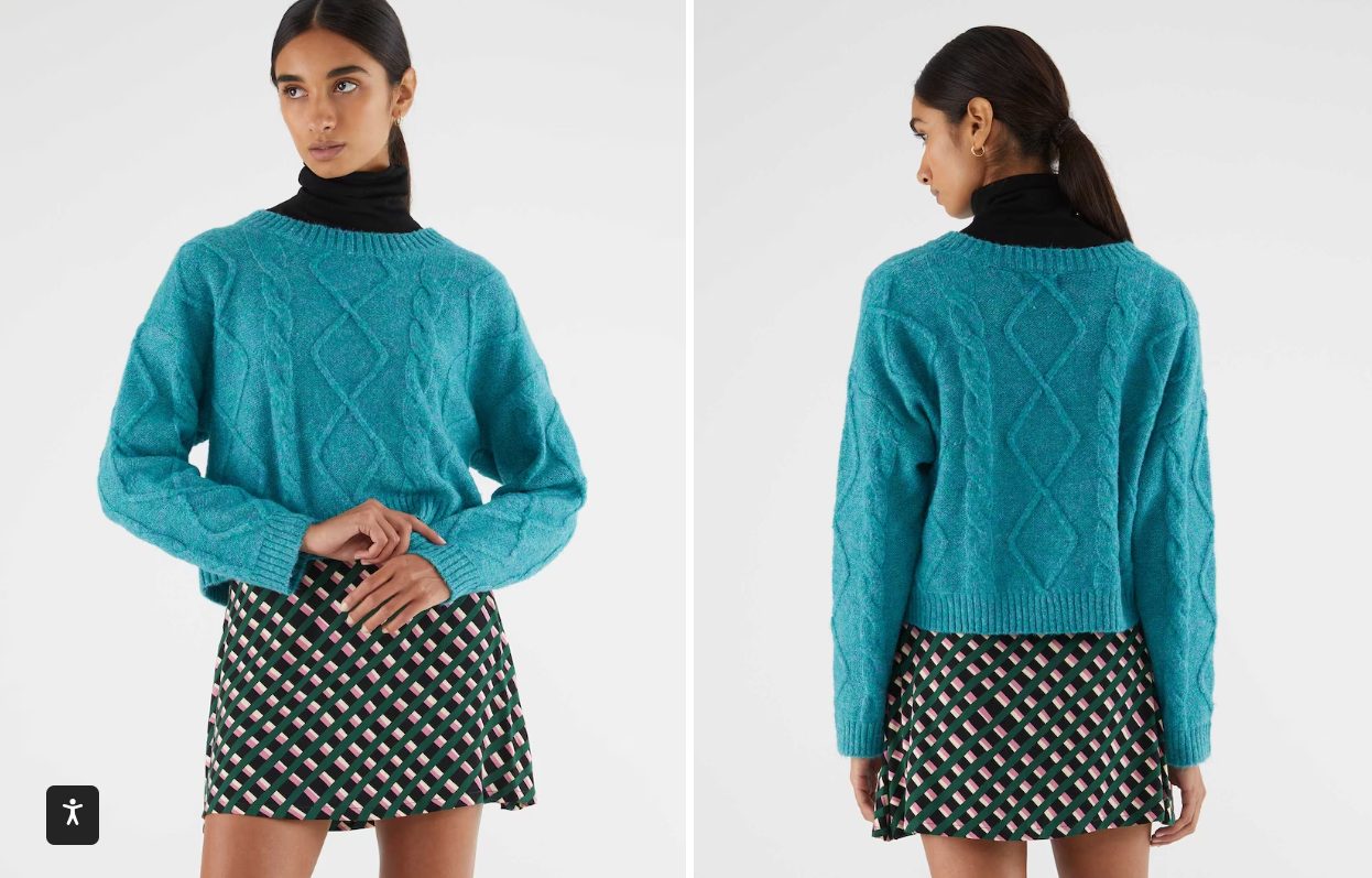Otro de los tonos más favorecedores que puedes elegir si lo que buscas es deslumbrar y hacer que tu rostro se ilumine es el azul turquesa. En este caso, si buscas un jersey de este color, uno de los que no podrás dejar escapar es este de la marca Compañía Fantástica y que ya tienes disponible en El Corte Inglés. De punto trenzado y sencillo, cuenta con un precio de solo 54,95 euros. Es una de esas novedades que merecen la pena.