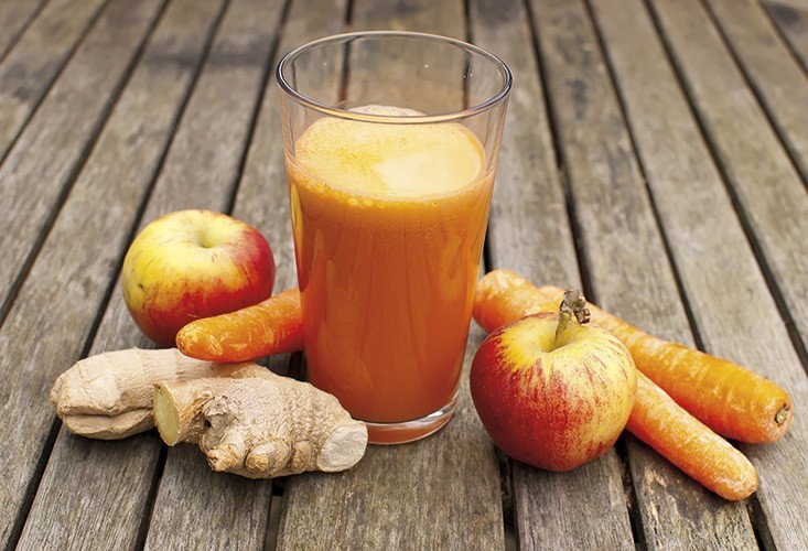 Disfruta de este licuado de manzana, zanahoria y jengibre con efecto remineralizante (calcio, hierro, potasio y fósforo) y una riqueza vitamínica que incluye vitamina C, E, del grupo B y betacarotenos.