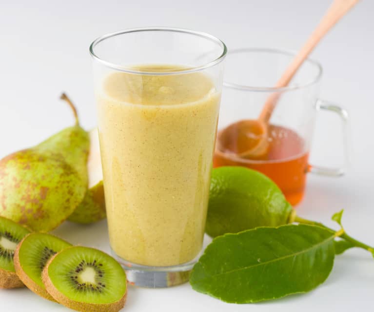 Prueba este refrescante zumo de kiwi y pera, cargado de fibra, minerales y vitaminas, siendo frutas bajas en calorías.