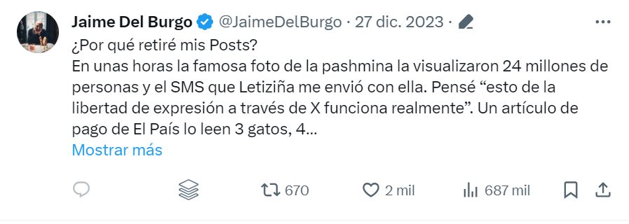 Aunque el revuelo que ha causado ha despertado interés incluso a nivel internacional, Jaime del Burgo ha afirmado que, de momento, solo ha compartido el 1% de las conversaciones que ambos mantuvieron. De hecho, asegura que hay cosas de su intimidad que no ha querido contar. Al menos, de momento. Del Burgo habla de una relación rota y llena de infidelidades. Este es el motivo de que el excuñado de Letizia haya optado por ir contando las cosas a través de las redes sociales. En este medio, ha revelado que Letizia le fue infiel a Felipe con él durante muchos años.
