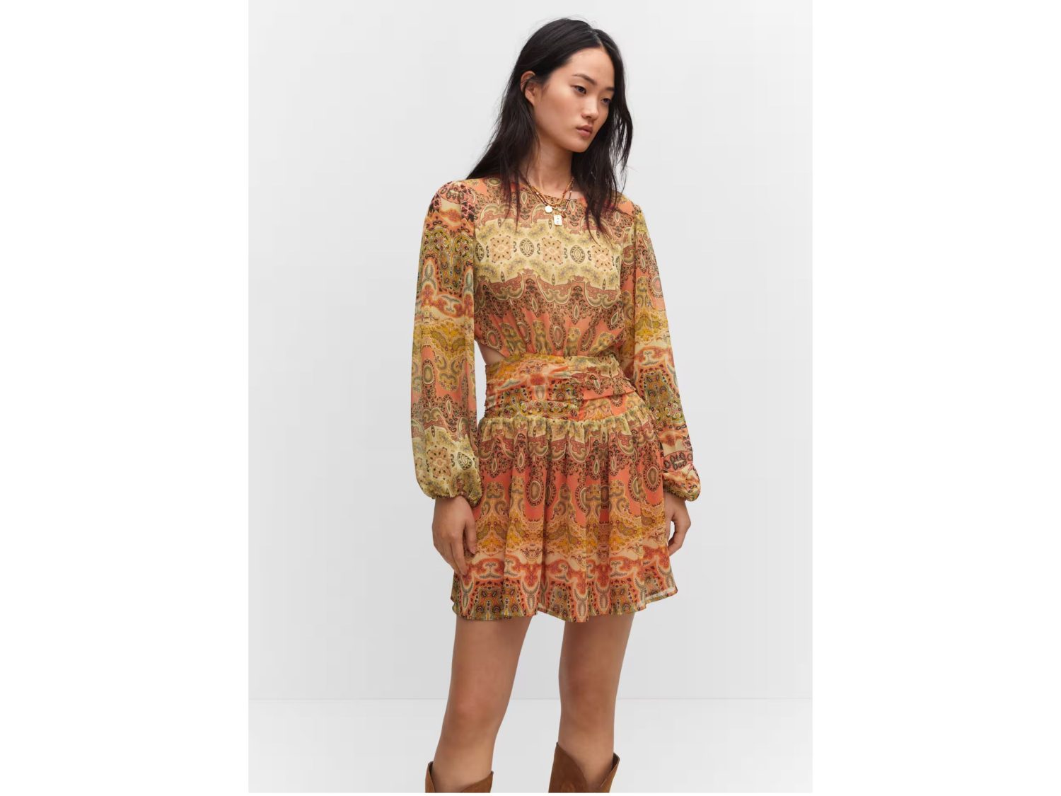 Inyecta un toque de alegría y color a los días grises de invierno con el vestido boho de Mango. Este vestido captura la esencia del optimismo con sus vibrantes tonalidades amarillas y naranjas, combinadas en un patrón romántico. Su diseño, ceñido en la cintura pero con volantes en la falda, lo convierte en una prenda llamativa y llena de movimiento. Además de su atractivo visual, este vestido es perfecto para crear un look impactante.