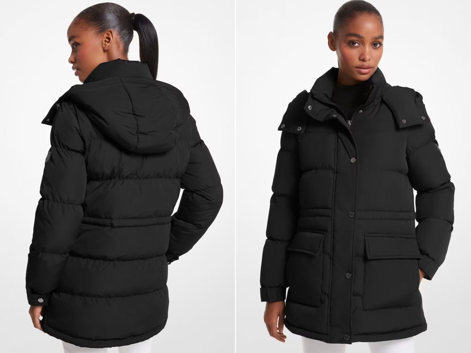 El plumífero resistente al agua de Michael Kors es una pieza fundamental para enfrentar el frío con elegancia y eficacia. Este abrigo, cuidadosamente diseñado con una capa acolchada de poliéster reciclado, no solo ofrece una protección eficiente contra el agua, sino que también contribuye a la preservación del medio ambiente. Su diseño incluye características funcionales como una capucha extraíble, un sistema de cierre doble con botones y cremallera, y puños ajustables con botón a presión, proporcionando así una adaptabilidad óptima a las variadas condiciones climáticas del invierno.