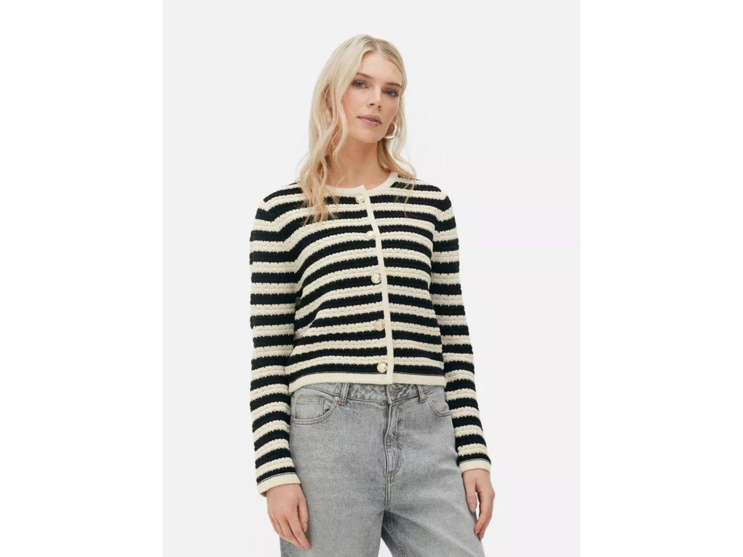 Comenzamos destacando esta chaqueta de punto con un sofisticado estampado de rayas en blanco y negro, una prenda que podría capturar la atención de Isabel Díaz Ayuso, conocida por su estilo distintivo. La buena noticia es que esta chaqueta, disponible en tallas hasta la 50, tiene un precio increíblemente asequible, tan solo 21 euros.