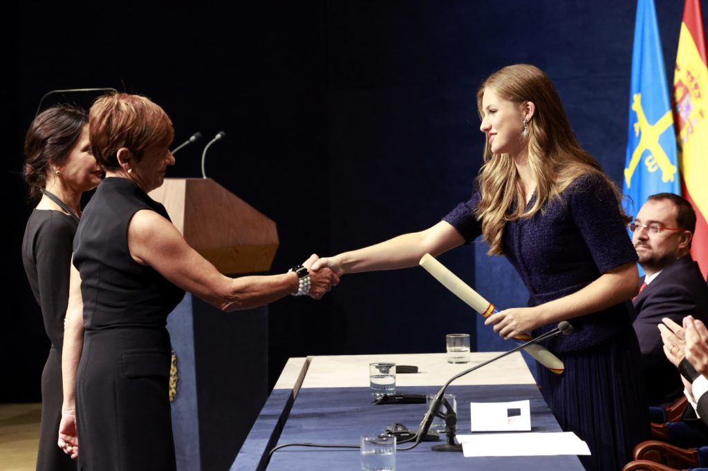 También en 2023 la princesa Leonor en los Premios Princesa de Asturias lució como vestimenta un sencillo dos piezas azul marino de Moisés Nieto que combinó con unos pendientes de aguamarinas y diamantes del joyero de su madre. Unas preciosas piezas desmontables en color azul cielo de Aldao.