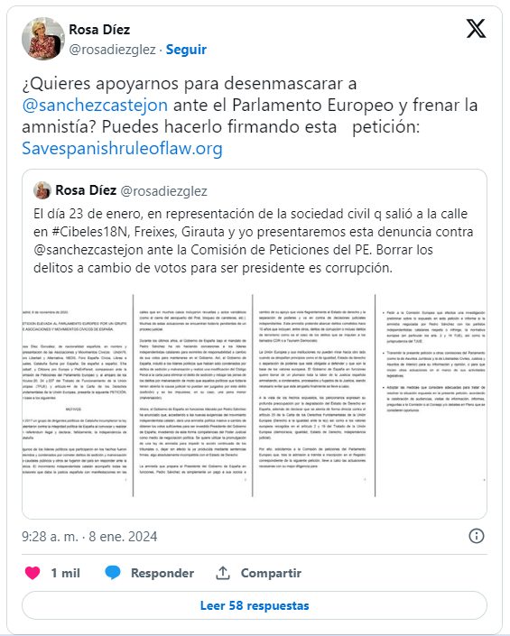 Además, Díez ha facilitado a través de su cuenta de X la petición que puede ser firmada por cualquiera a través de esta dirección: dirección: https://savespanishruleoflaw.org/. «Creemos que Europa tiene que actuar porque a nuestro juicio, tal y como planteamos en el documento que presentamos, esto va en contra de la Carta de Derechos Fundamentales de la Unión Europea, que es la que establece el derecho a la igualdad ante la ley de todos los europeos», explica la política, quien defenderá en nombre de todas las asociaciones que participaron en la organización de la manifestación multitudinaria celebrada en la madrileña Plaza de Cibeles el pasado mes de diciembre.