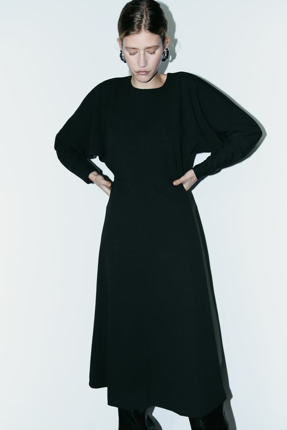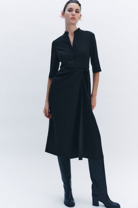 Este sencillo vestido de cuello fluido con lazada y manga larga está en la web de Zara al increíble precio de 17,99€. Cuenta con un detalle de frunces delanteros y bajo con abertura y cierre lateral con cremallera oculta en costura. Lo puedes encontrar en la web de la talla XS a la XL y el tono del vestido es negro.