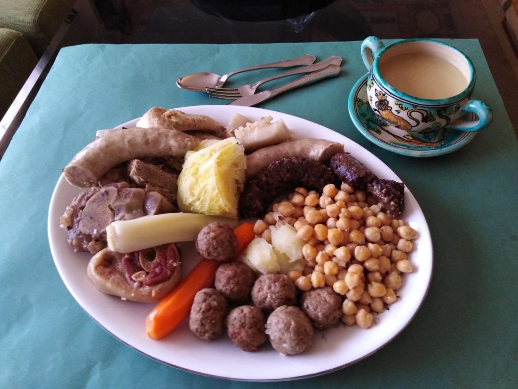 - Ensamblaje Final: Agrega las carnes hervidas y las butifarras a las verduras y garbanzos. Cocina a fuego lento durante unos 15 minutos para que los sabores se mezclen.