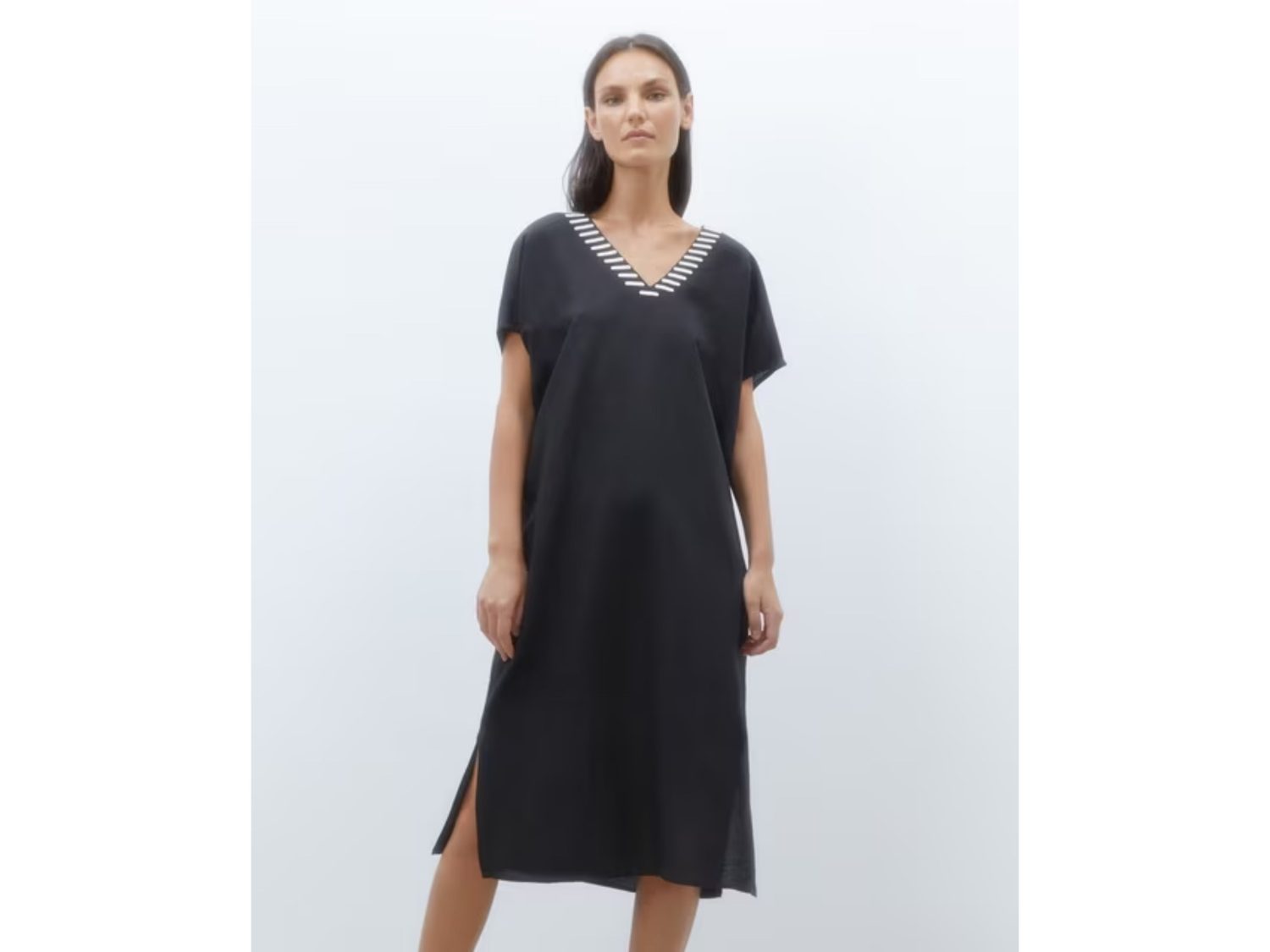 En el mundo de la moda, el color negro es sinónimo de elegancia y una opción segura para estilizar la figura. Nuestra selección de El Corte Inglés incluye dos vestidos negros que destacan por su capacidad de afinar la silueta con sutileza y sofisticación. El primero es un vestido tipo túnica, ideal para el día a día gracias a su diseño holgado que no sacrifica estilo por comodidad. Su cuello en pico y detalles geométricos aportan un toque moderno y versátil.