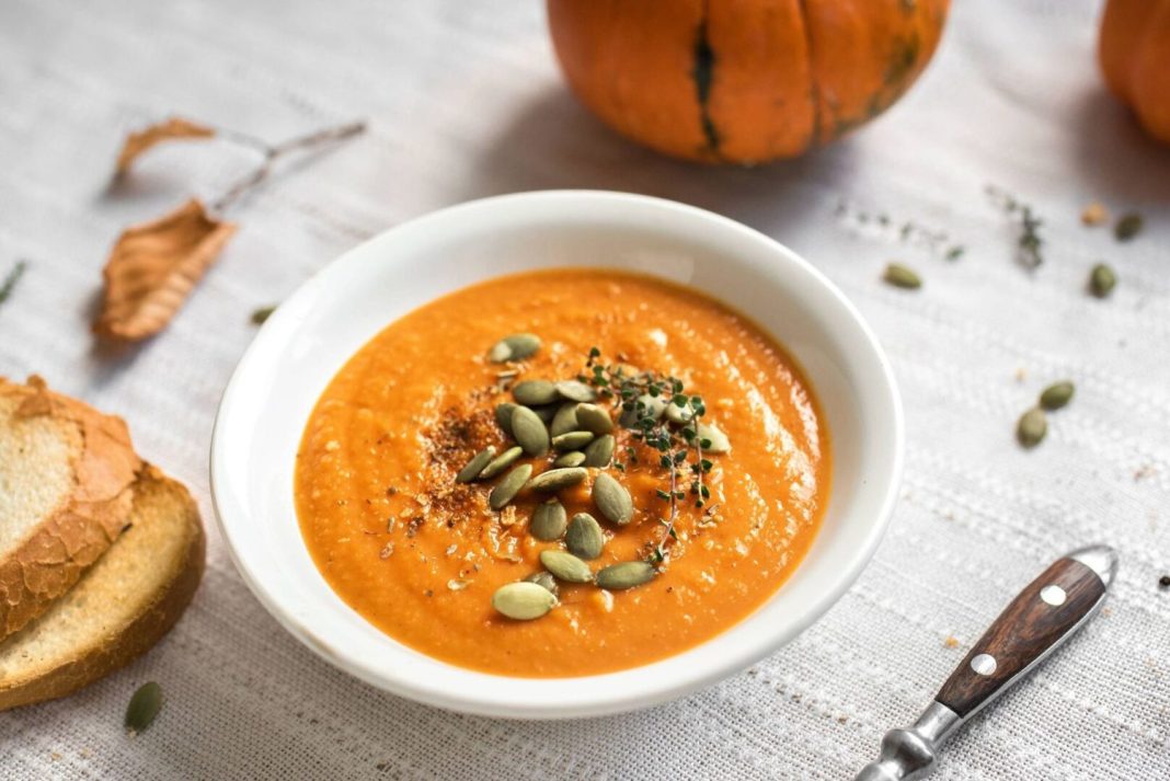 Hornea durante una hora (puedes asar primero la calabaza 10 minutos en el microondas y luego hornear todo durante media hora para ahorrar tiempo y energía). Si no usas microondas, hornea todo durante una hora. Pela la calabaza y el pimiento rojo. Tritura todo en un robot de cocina o con una batidora de mano. Agrega el queso crema, el aceite de oliva y el caldo gradualmente hasta lograr la textura deseada. Añade hojas de albahaca.