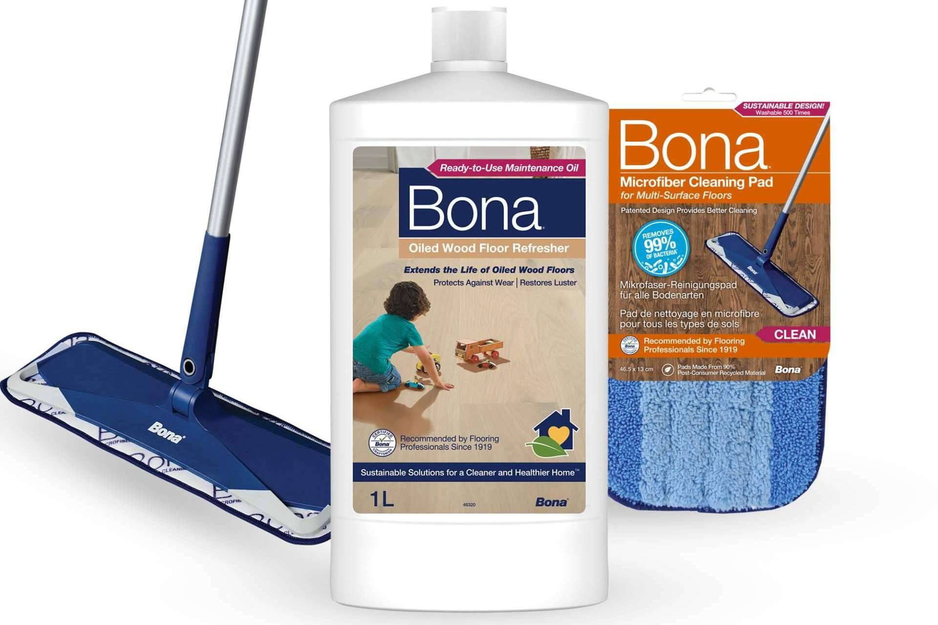 Bona es una empresa familiar con sede en Suecia con más de 100 años de experiencia en la fabricación de productos para la instalación, renovación y mantenimiento de los suelos de alta calidad. Entre los productos recomendados por la marca Bona para limpiar un suelo de madera aceitado se encuentran el limpiador neutro concentrado Bona Oil Soap, para aplicar con fregona y la mopa pulverizadora Bona Spray Mop Premium para suelos aceitados con limpiador incorporado. Para renovar este tipo de suelos Bona recomienda su producto Renovador para maderas aceitadas Bona que recupera el aspecto y lustre de un suelo aceitado. Todos estos productos están formulados para proteger el acabado aceitado del suelo de madera y mantenerlo en óptimas condiciones por más tiempo.