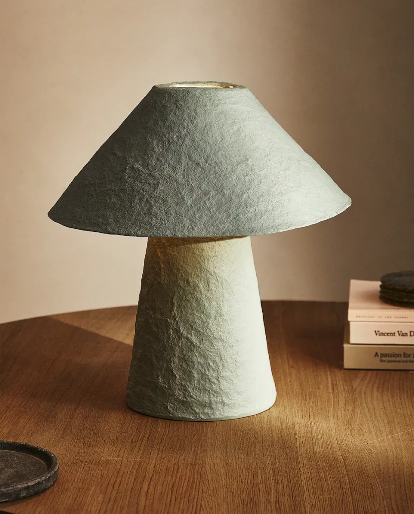 Una original y moderna lámpara de mesa que queda bien en cualquier hueco de una habitación o en el rincón de un tranquilo. Este modelo cuesta 129 y es perfecto para dormitorios para jóvenes. Este modelo cuenta con una pantalla cónica y la puedes encontrar en las tiendas físicas de Zara Home y en la página web. La base es 100% papel y la pantalla 97% papel y 3% acero.