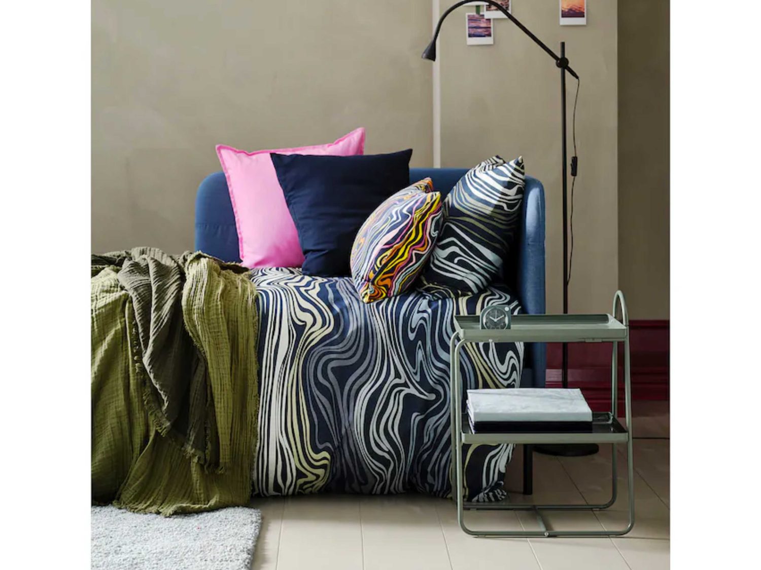 En un mundo donde el tiempo al aire libre se reduce en invierno y los días grises parecen prolongarse, la necesidad de dar vida y color a nuestros espacios interiores se vuelve esencial. Es en este contexto que la nueva colección de textiles de Ikea se erige como una solución perfecta. Con su funda nórdica llena de estampados psicodélicos de aires setenteros, líneas y garabatos en colores azules y arena contrastados, ofrece un cambio de imagen de 180° a tu dormitorio.