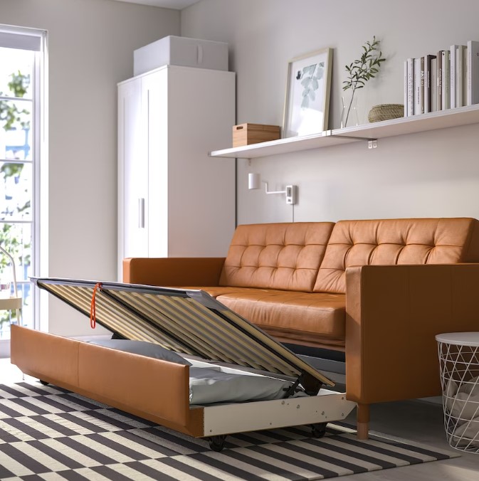 En este sofá de tres plazas de Ikea se puede uno sentarse de una manera recta con total comodidad, así como dormir plácidamente gracias a los listones de madera de la estructura. Se puede transformar en una cama doble y guardar la ropa de cama bajo el asiento para tenerla a mano y mantener así la habitación ordenada cuando no la uses.